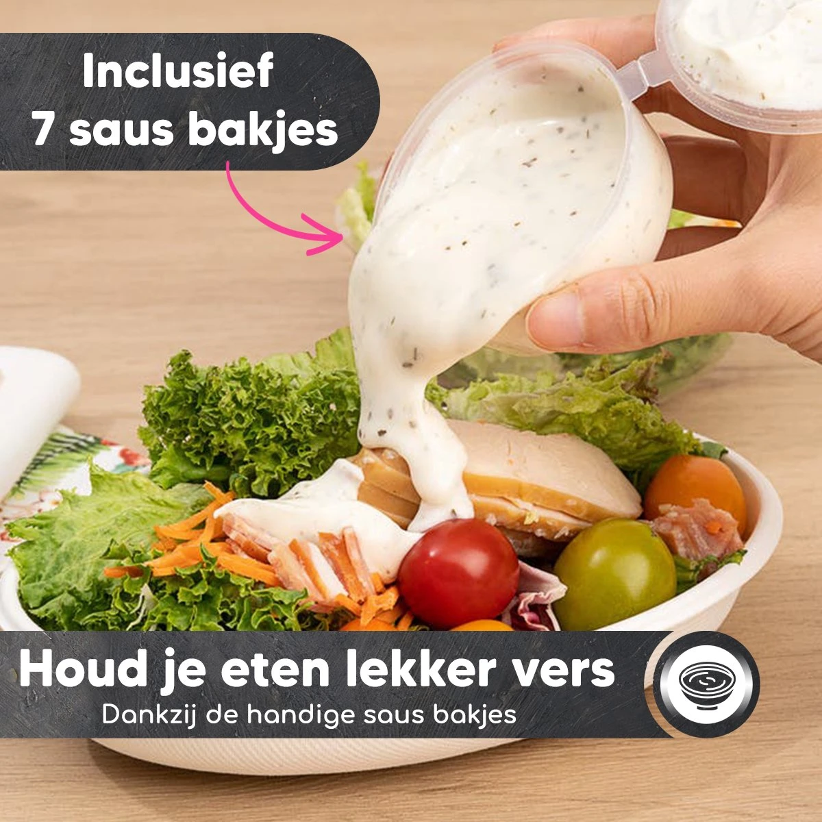 Je ontvangt 7 stuks Meal Prep Bakjes, inclusief 7 kleine bakjes voor saus, noten of dressing etc. Deze kleine bakjes passen ook in de grote bakjes. Zo kun je bijvoorbeeld je salade meenemen in het grote bakje en je dressing in het kleine bakje. Het bakje met dressing stop je dan in het grote bakje zodat je uiteindelijk maar 1 bakje mee hoeft te nemen. Zo kun jij in je lunchpauze toch lekker vers je salade eten.