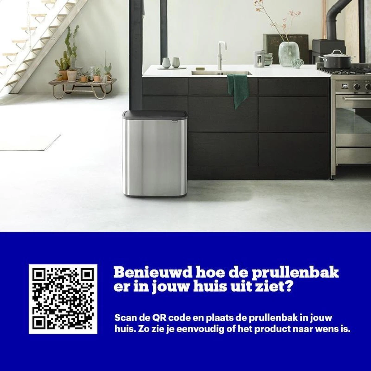 Ben je benieuwd naar hoe deze prullenbak er in jouw huis uit ziet? Dat kan! Ga naar ‘Bekijk artikel in huis’ en klik op ‘Lees hier hoe de actie werkt’. Zo kun je de prullenbak op iedere gewenste plek in jouw huis plaatsen en kun je zien of deze in de ruimte past en of de kleur mooi staat.