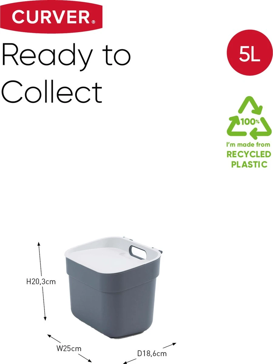Ready to Collect is de ideale oplossing voor afvalscheiden in huis! Naast dat de lijn modulair & erg functioneel is komt de Ready to Collect lijn in een fris en modern kleurenpalette dat past in elke keuken of garage. Verkrijgbaar in verschillende maten: van een 5L GFT compostbak voor in de keuken, tot een 10L, 20L of zelfs 30L afvalbak. Daarnaast zijn de prullenbakken gemaakt van 100% gerecycled kunststof. Het verzamelen van bijvoorbeeld papier, plastic of lege flessen was nog nooit zo makkelijk en duurzaam.
