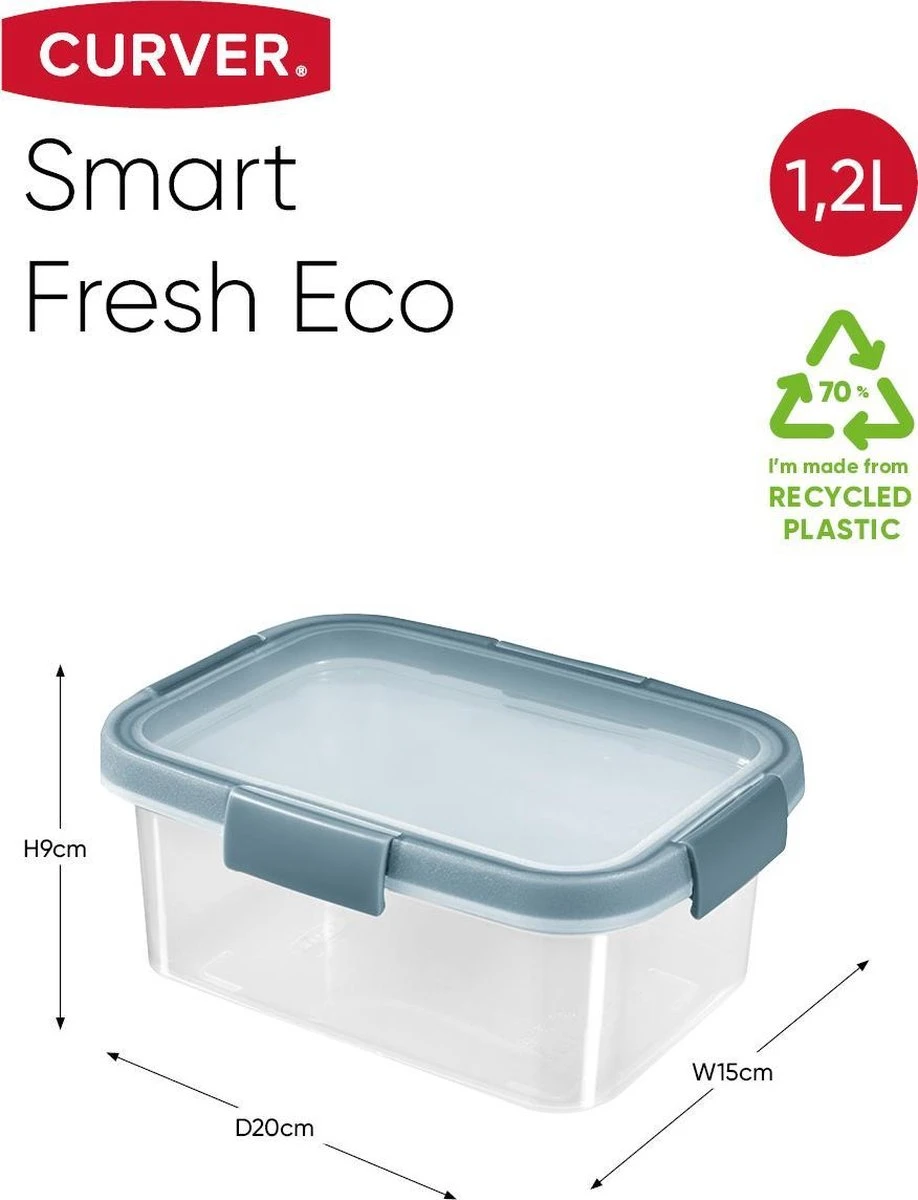 - Curver Smart Fresh Eco Vershoudbakje met deksel – Rechthoekig – 1,2L – Transparant/Smokey Grey