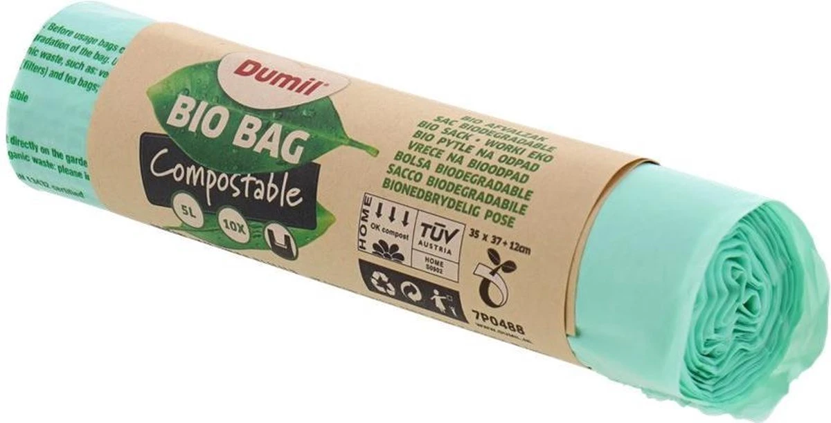De Biozak van Dumil® is in diverse formaten beschikbaar. U ontvangt 10 rollen van 10 zakken, in totaal 100 zakken van 5 liter. Kiemplantlogo en Compostkeurmerk