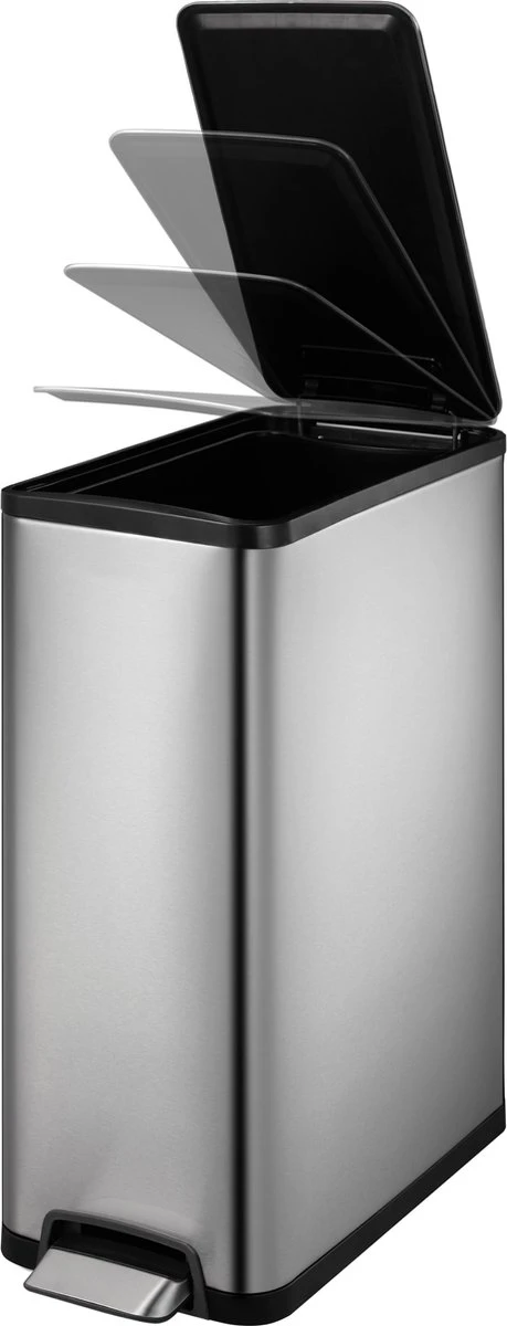 De matzilverkleurige EKO Ecoslim pedaalemmer met een inhoud van 40 L is een trendy afvalemmer met twee kunststof binnenbakken van 20 L voor afvalscheiding.