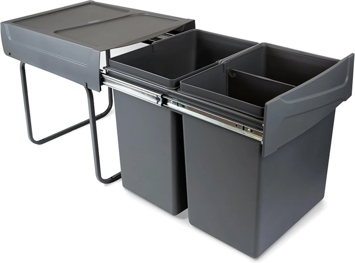 Deze uittrekbare, inbouw prullenbak van Eleganca is een must-have om jouw keuken modern, hygiënisch en georganiseerd in te richten. Deze Eleganca afvalbak 2x20L is eenvoudig te monteren, vriendelijk in gebruik en gemaakt van hoge kwaliteit kunststof. Door het moderne design van deze inbouw afvalbak voor afvalscheiding, met uitneembare emmers van 2×20 liter en het formaat van B34,2 x D46.9 x H38.9 cm, past deze afvalbak mooi in elke keuken. De afvalemmer is voorzien van een metalen kogel gelagerd uittrekmechanisme en een rubberen stop voor het geluiddempend sluiten van de lade prullenbak. De afvalbak is geschikt voor huishoudelijk afval, is uittrekbaar en eenvoudig te monteren aan de bodem van een (keuken)kast voor een maximale gebruikerservaring. Hiernaast heeft één van de emmers een tussenschot om uw afval te scheiden.