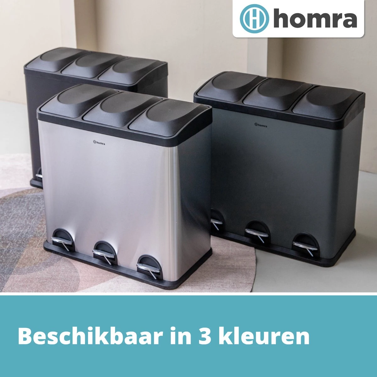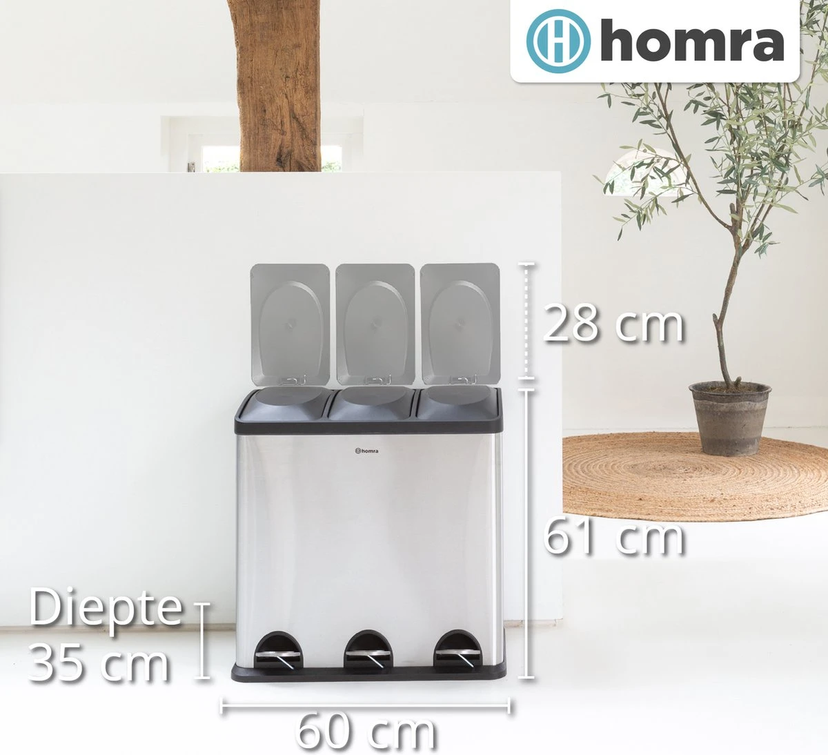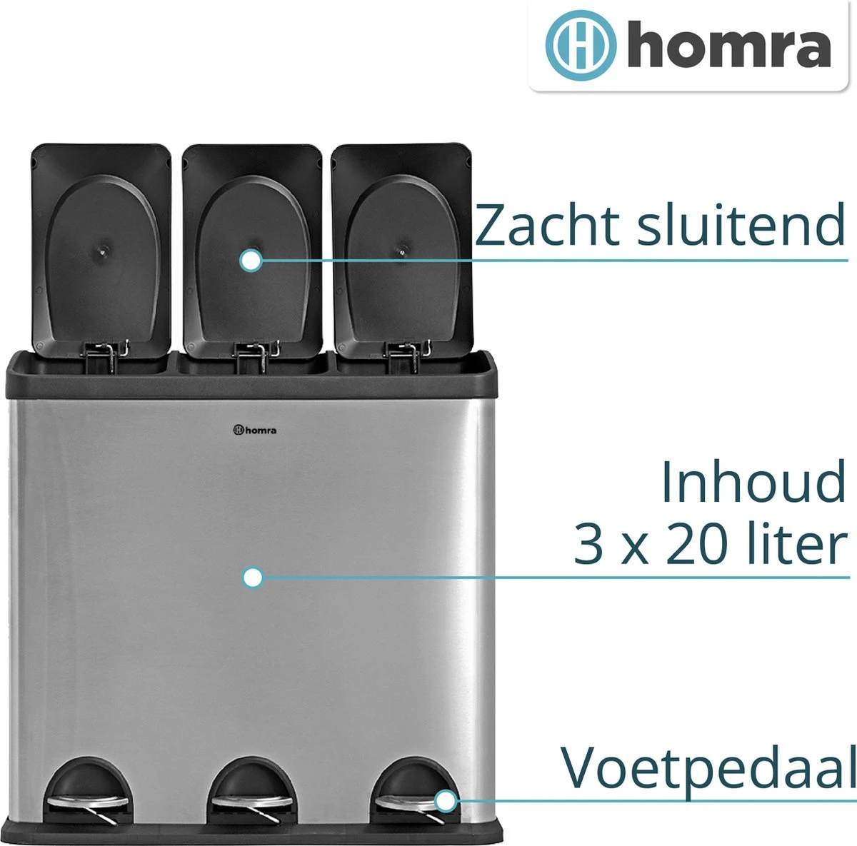 Mooie afvalscheidingsprullenbak met 60 liter inhoud (3 x 20 liter). Handig en hygiënisch in gebruik en met een luxe uitstraling. Deze pedaalemmer is ideaal voor thuis en op kantoor!