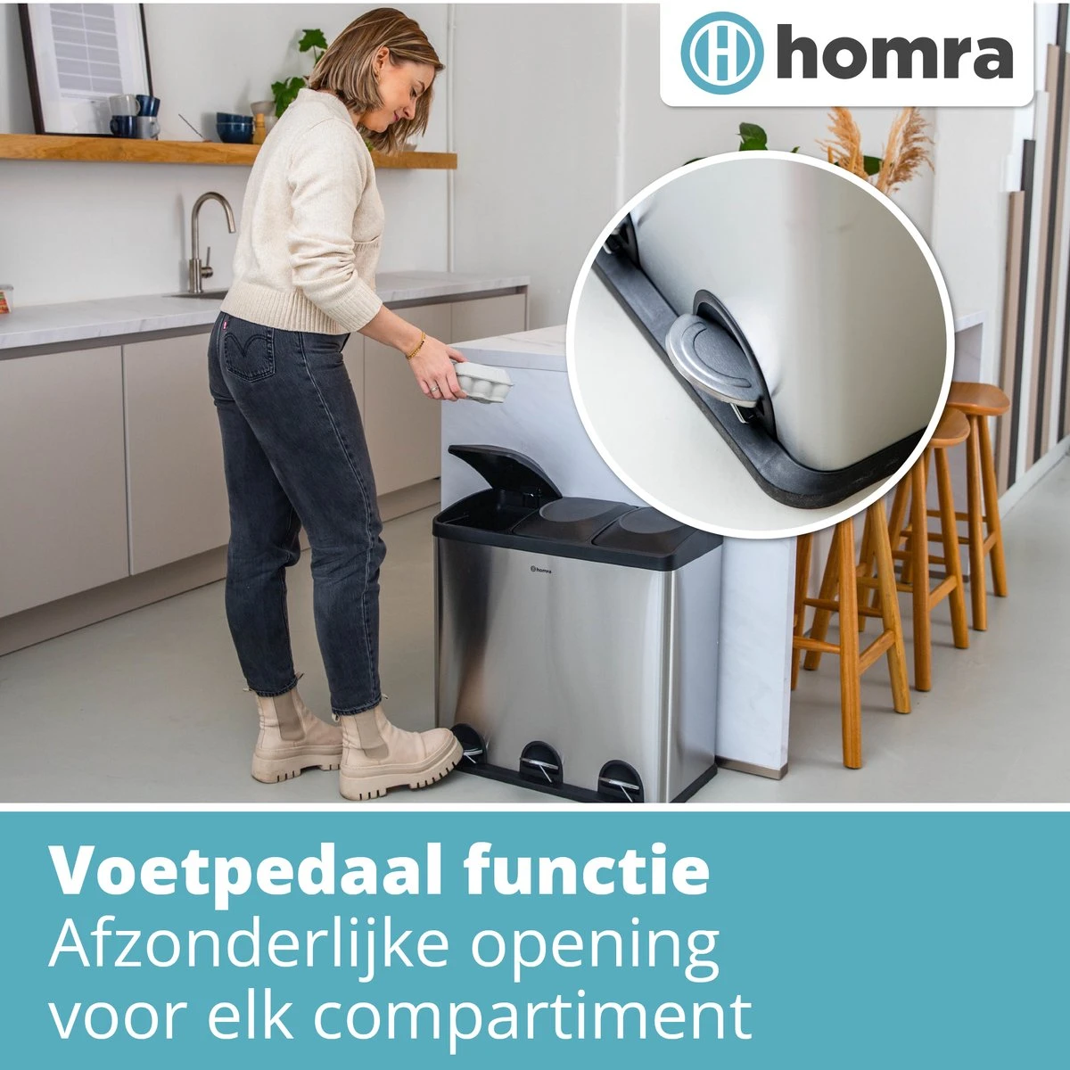 Een groot pluspunt van de prullenbak zijn de losse deksels. Als je afval wilt weggooien open je het juiste compartiment met het voetpedaal. Daarna gooi je het afval makkelijk en snel weg. De andere compartimenten blijven gesloten dus je opent alleen het compartiment dat je nodig hebt!
