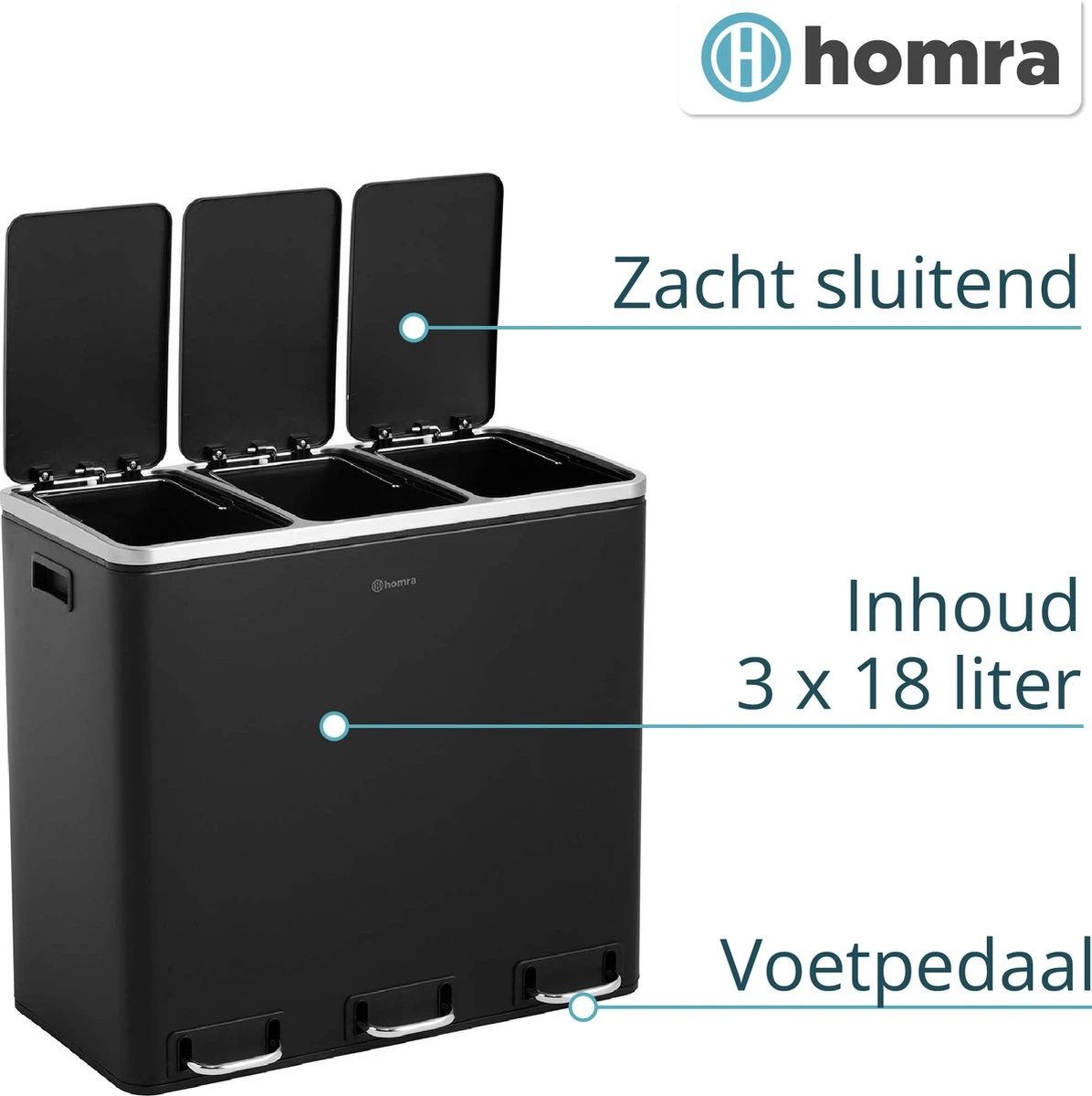 Mooie zwart gekleurde afvalscheidingsprullenbak met 54 liter inhoud (3 x 18 liter). Handig en hygiënisch in gebruik en met een luxe uitstraling. Ideaal voor thuis en op kantoor!