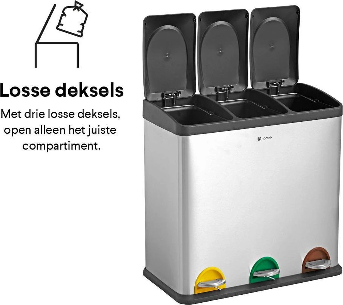 Een groot pluspunt van de prullenbak zijn de losse deksels. Als je afval wilt weggooien open je het juiste compartiment met het voetpedaal. Daarna gooi je het afval makkelijk en snel weg. De andere compartimenten blijven gesloten dus je opent alleen het compartiment dat je nodig hebt!