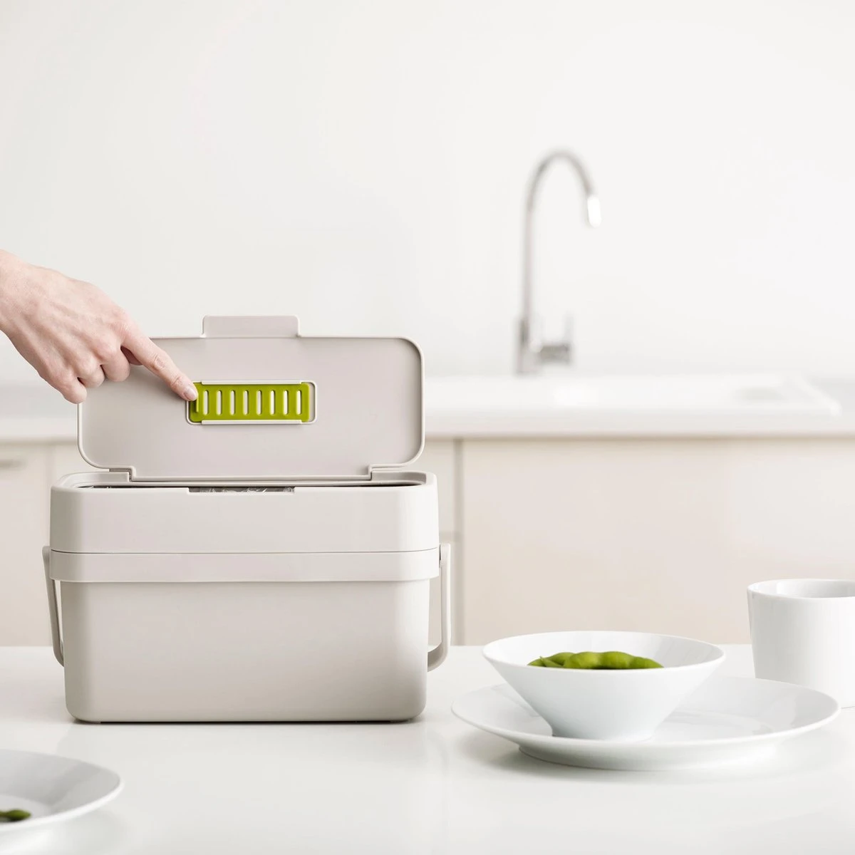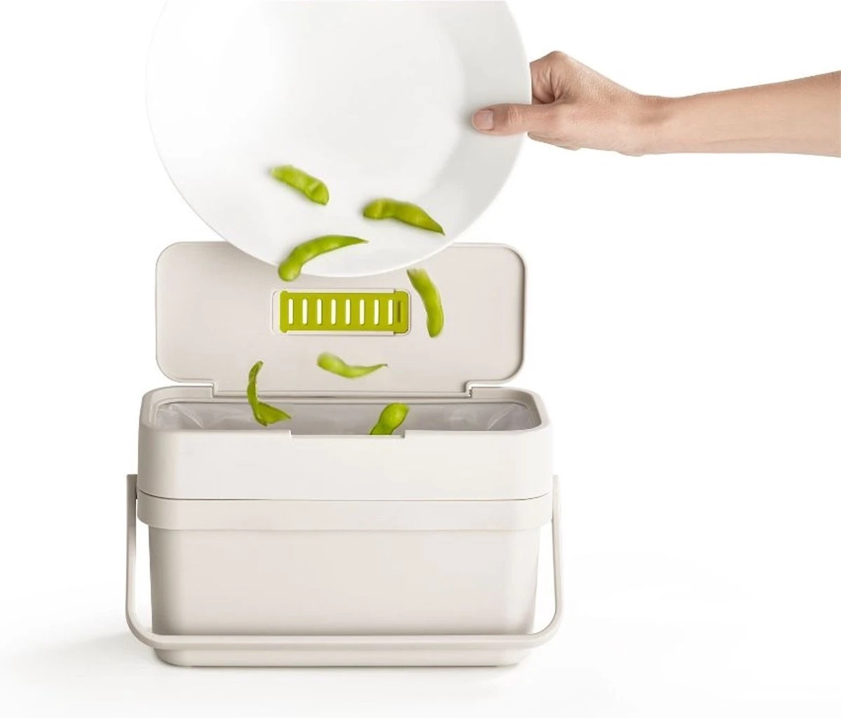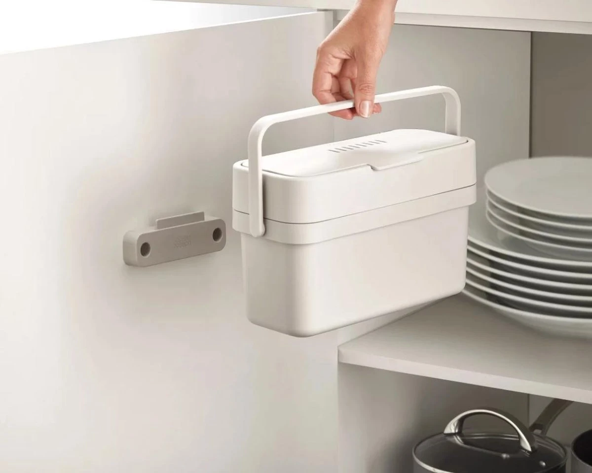 Joseph Joseph staat bekend om haar keukenproducten met mooi en slim design. De emmer is compact en heeft een wijde opening aan de bovenkant. Tevens heeft de emmer een verstelbare ventilatie opening om geurtjes en vocht te reduceren.