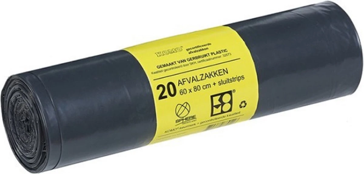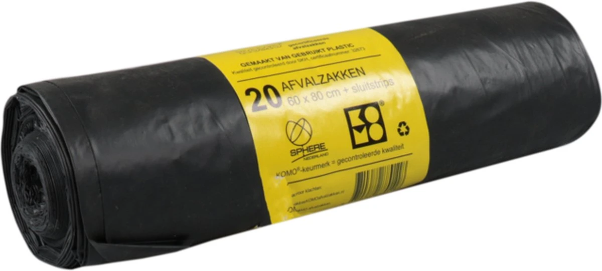 De gecertificeerde afvalzak van gecontroleerde kwaliteit is gemaakt van gebruikt plastic. Met een formaat van 60 x 80 cm en een volume van 60 liter is deze KOMO-huisvuilzak geschikt voor de meeste afvalbakken en voor vele soorten afval.