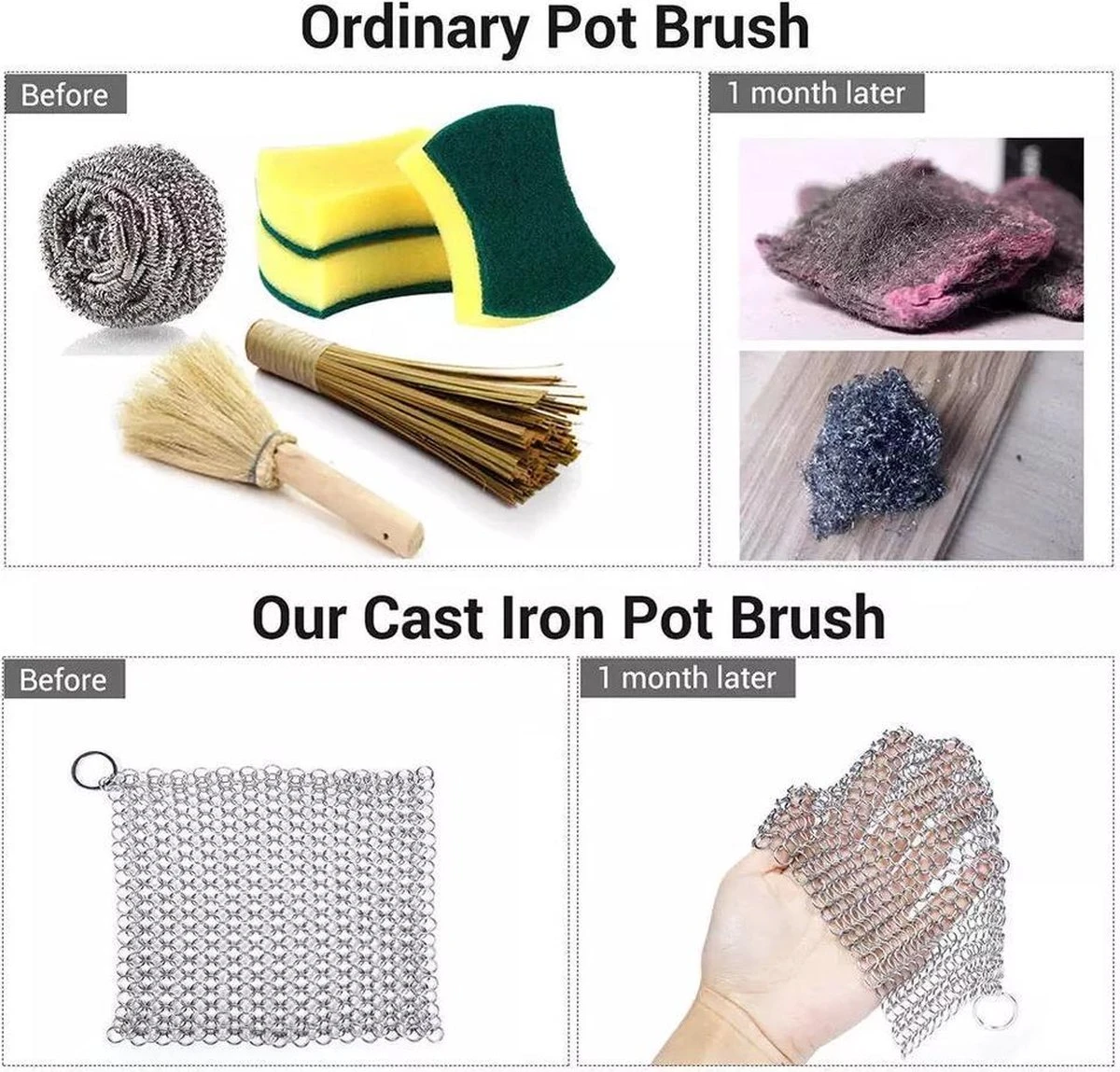 Hiermee maakt u in een handomdraai uw giet- smeedijzeren pannen schoon. Een sterke roestvrij stalen scrub.