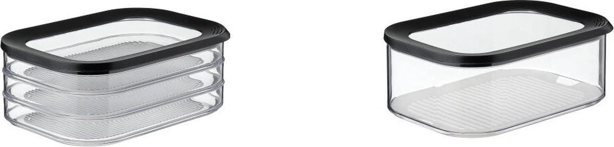 Vleeswarendoos Modula 550/3, voorzien van een doorzichtige deksel met zwarte ring. De rechthoekige Modula vleeswarendoos met afgeronde hoeken heeft een inhoud van 1650 ml en geeft direct zicht op inhoud, ook in de koelkast! De zwarte afdichtring zorgt voor een perfecte afsluiting, waardoor deze doos geschikt is voor het bewaren van diverse vleeswaren in 3 lagen. De Modula bewaar- en opbergdozen van Mepal zijn verkrijgbaar in verschillende maten en uitvoeringen, liggen goed in de hand en zijn makkelijk te openen. Bovendien zijn ze stapelbaar en vaatwasmachinebestendig. Hoe veeleisend u ook bent: Modula bewaardozen zijn erop berekend!