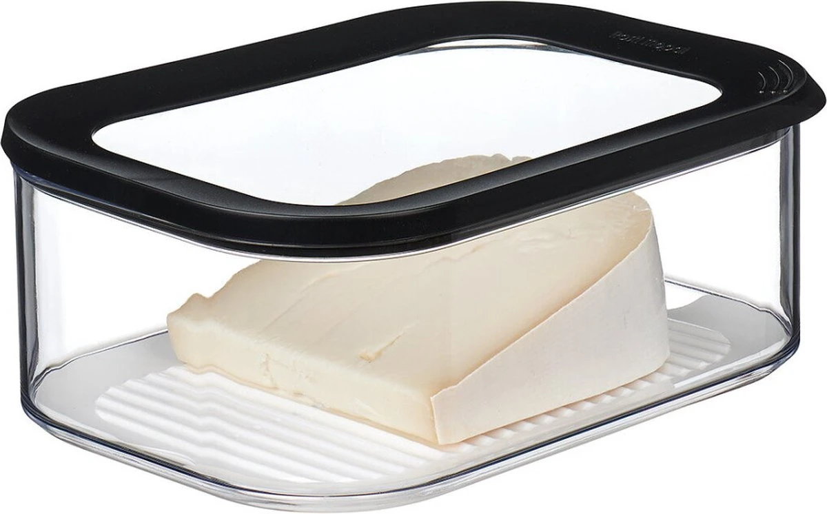 Kaasdoos Modula, voorzien van een doorzichtige deksel met zwarte ring. De rechthoekige Modula kaasdoos met afgeronde hoeken heeft een inhoud van 2000 ml, is standaard voorzien van een anticondens tray en geeft direct zicht op inhoud, ook in de koelkast! De zwarte afdichtring zorgt voor een perfecte afsluiting, waardoor deze doos geschikt is voor het bewaren van diverse kaassoorten. De Modula bewaar- en opbergdozen van Mepal zijn verkrijgbaar in verschillende maten en uitvoeringen, liggen goed in de hand en zijn makkelijk te openen. Bovendien zijn ze stapelbaar en vaatwasmachinebestendig. Hoe veeleisend u ook bent: Modula bewaardozen zijn erop berekend!