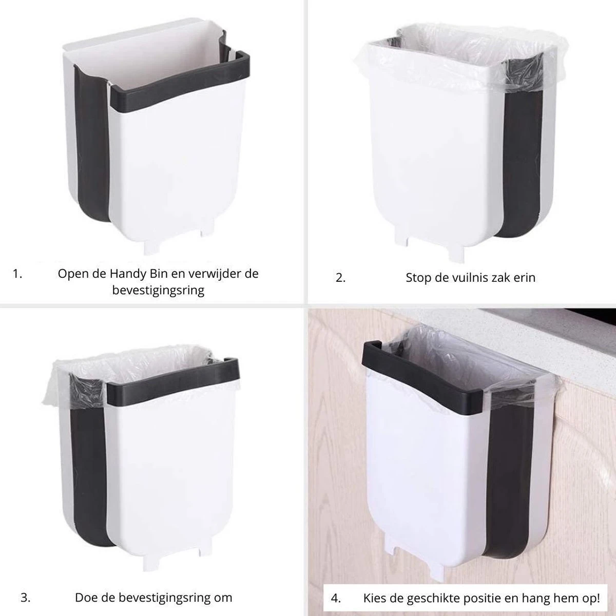 Het toevoegen van een rolletje afvalzakjes is dit handig voor het eerste gebruik van de Handy bin. Door middel van de zwarte strip boven aan de Handy Bin blijft het afvalzakje stevig vast zitten. De zwarte strip boven aan de prullenbak is afneembaar, u kunt hem dan ook gebruiken om de schillen erin te vegen. Na gebruik kan het afvalzakje gemakkelijk uit de Handy Bin worden verwijderd. Door het kleine formaat van de Handy Bin kunt u deze gemakkelijk opbergen. Ook kunt u de Handy Bin opvouwen tegen de keukendeurtjes.