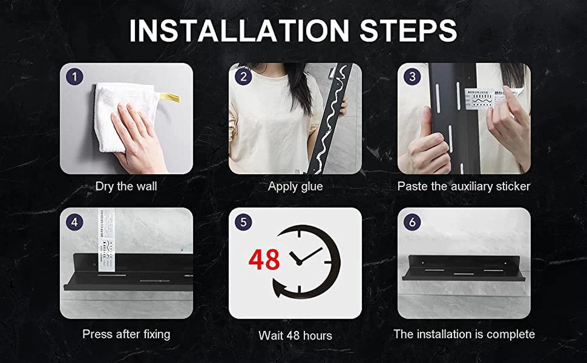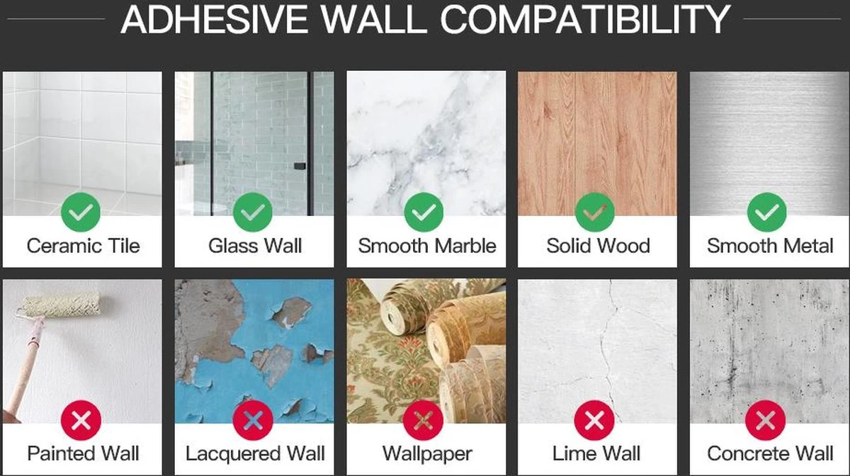 - Plak het rek niet op geschilderde muren of behang, omdat het je verf of behang verwijdert. De lijm kan alleen op gladde oppervlakken zoals keramische tegels, glas, glad hout, metaal of andere onbehandelde oppervlakken worden aangebracht. Druk bij het opplakken de lucht uit de sticker en blijf uit de buurt van voegen tussen keramische tegels.