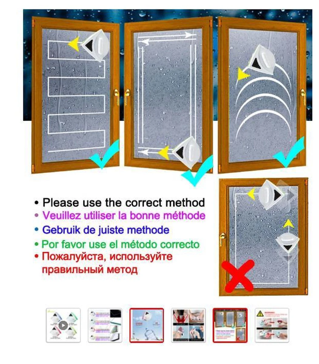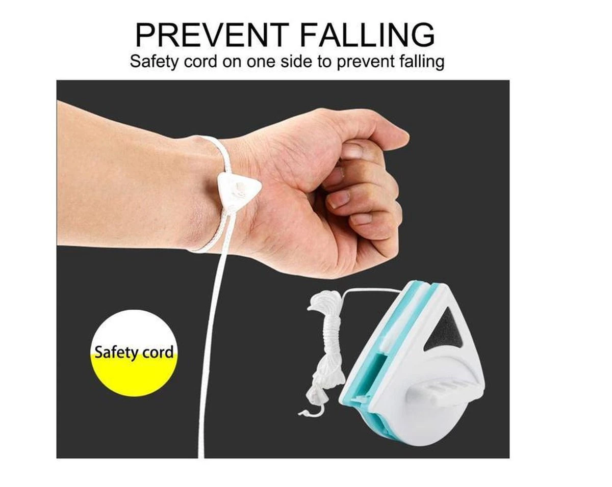 Het driehoekige design van de ruitenwasser maakt het mogelijk om in lastige hoekjes schoon te maken zonder enige moeite. De magnetische raamwisser bestaat uit twee helften met daarin magneten bevestigd, ingebouwde sponsjes om uw raam te reinigen en rubberen wissers om uw raam droog te vegen. De sponsjes en wissers kunnen eenvoudig op het product worden bevestigd/van het product worden verwijderd om deze te vervangen voor nieuwe schone sponsjes/wissers. Met behulp van het anti-valtouw voorkomt u dat de ruitenwisser naar beneden valt.