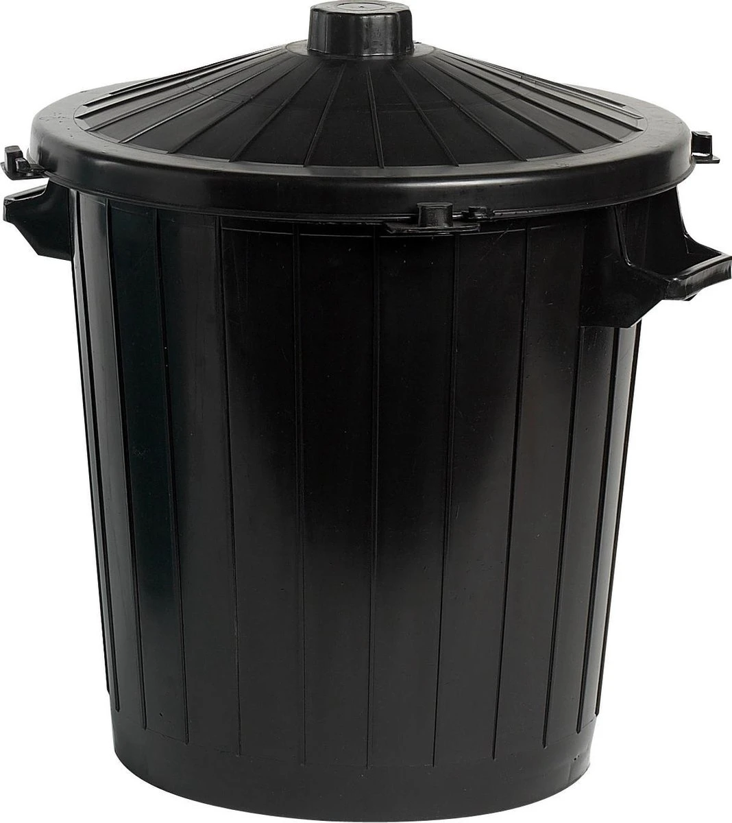 Vuilnisbak/afvalemmer met deksel 80 liter zwart. Ronde emmer met deksel. De zwarte emmer is te gebruiken als prullenmand, luieremmer of om afval mee te scheiden. Dankzij het deksel worden de meeste geurtjes tegengehouden, waardoor de mand ook geschikt is om te gebruiken voor het scheiden van GFT afval of voor het weggooien van luiers. Materiaal: kunststof/plastic. Formaat: ca diameter 54cm, hoogte 72 cm. Inhoud: 80 liter. Ronde afvalemmer/vuilnisemmer met deksel. Afval scheiden emmertje met deksel.