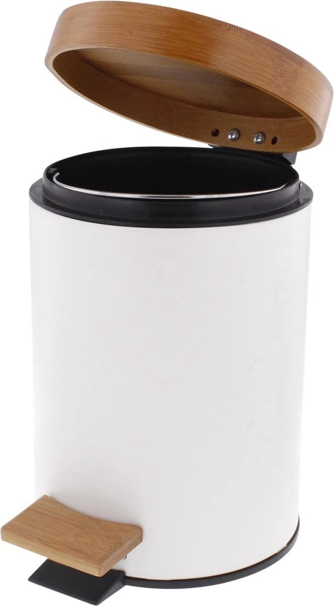 Mooie kleine prullenbak met Scandinavisch design. De bamboe deksel zorgt voor een uniek, strak design dat in bijna alle badkamers past. De afvalbak is gemaakt van sterk kunststof en bamboe, dat een lange levensduur garandeert. Daarbij is hij gemakkelijk open te maken door middel van het pedaal, waardoor je je handen niet vies hoeft te maken bij het openmaken. In de prullenbak bevindt zich een emmer, waar eventueel nog een afvalzakje in gestopt kan worden. De emmer is voorzien van een handvat om gemakkelijk de rommel weg te gooien.