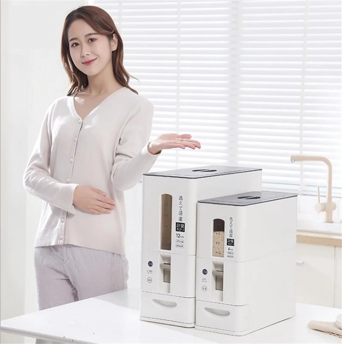 Met onze japans rijst dispenser haal je luxe en gemak in huis! Een handige keukenaccessoire voor het bewaren van rijst of granen Met een draai aan de knop komt de rijst er perfect gedoseerd uit. Geen half lege zakken meer meer in de la of losse bussen maar een prachtig item op je keukenblad. De inhoud blijft vers doordat er een deksel op de houders zit.