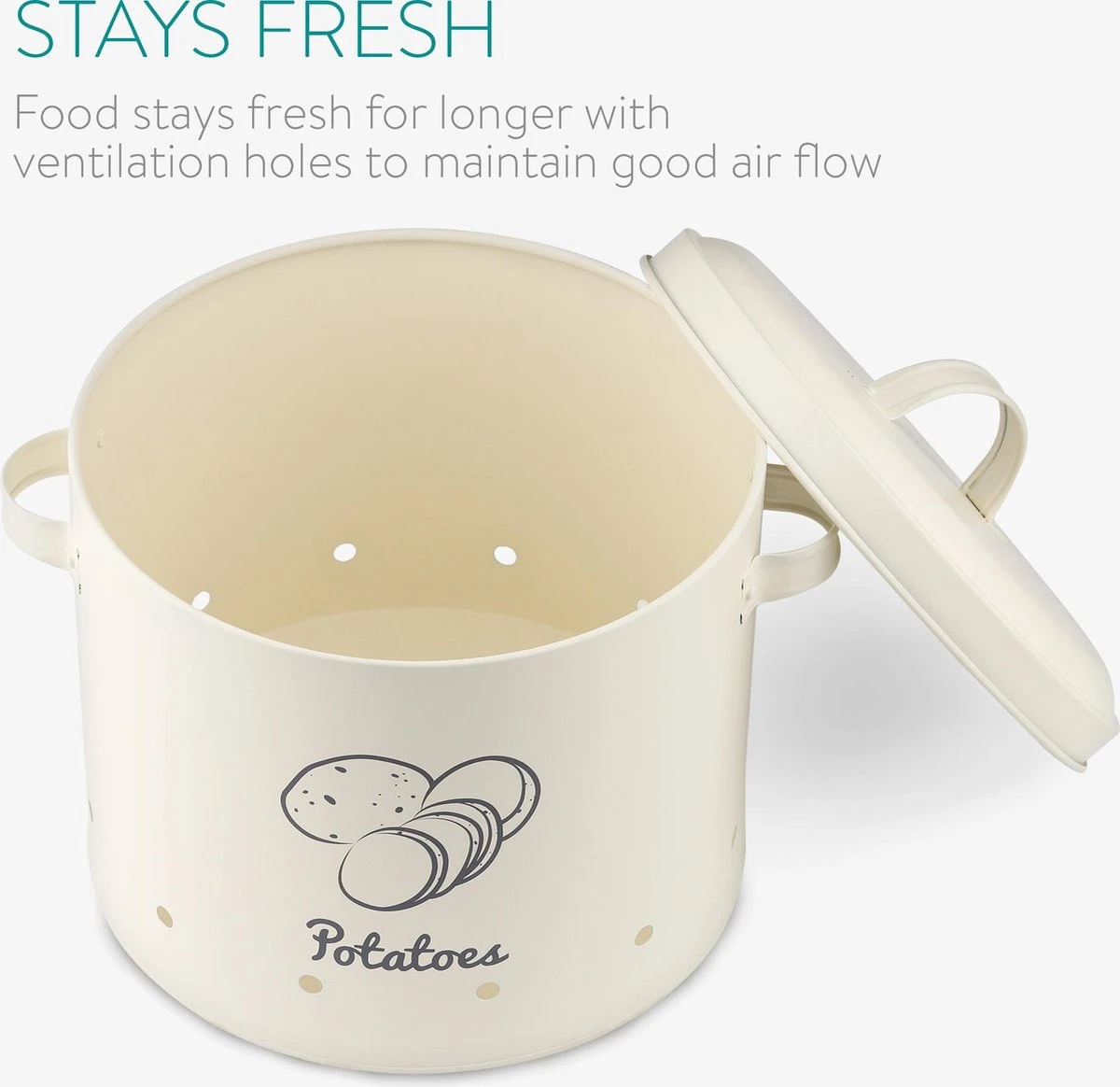 - HOU PRODUCTEN VERS: Elk van deze bewaarblikken is speciaal ontworpen om je aardappelen, uien en knoflook zo vers mogelijk te houden. De kleine gaatjes zorgen voor luchtcirculatie en dus voor maximale duurzaamheid.
