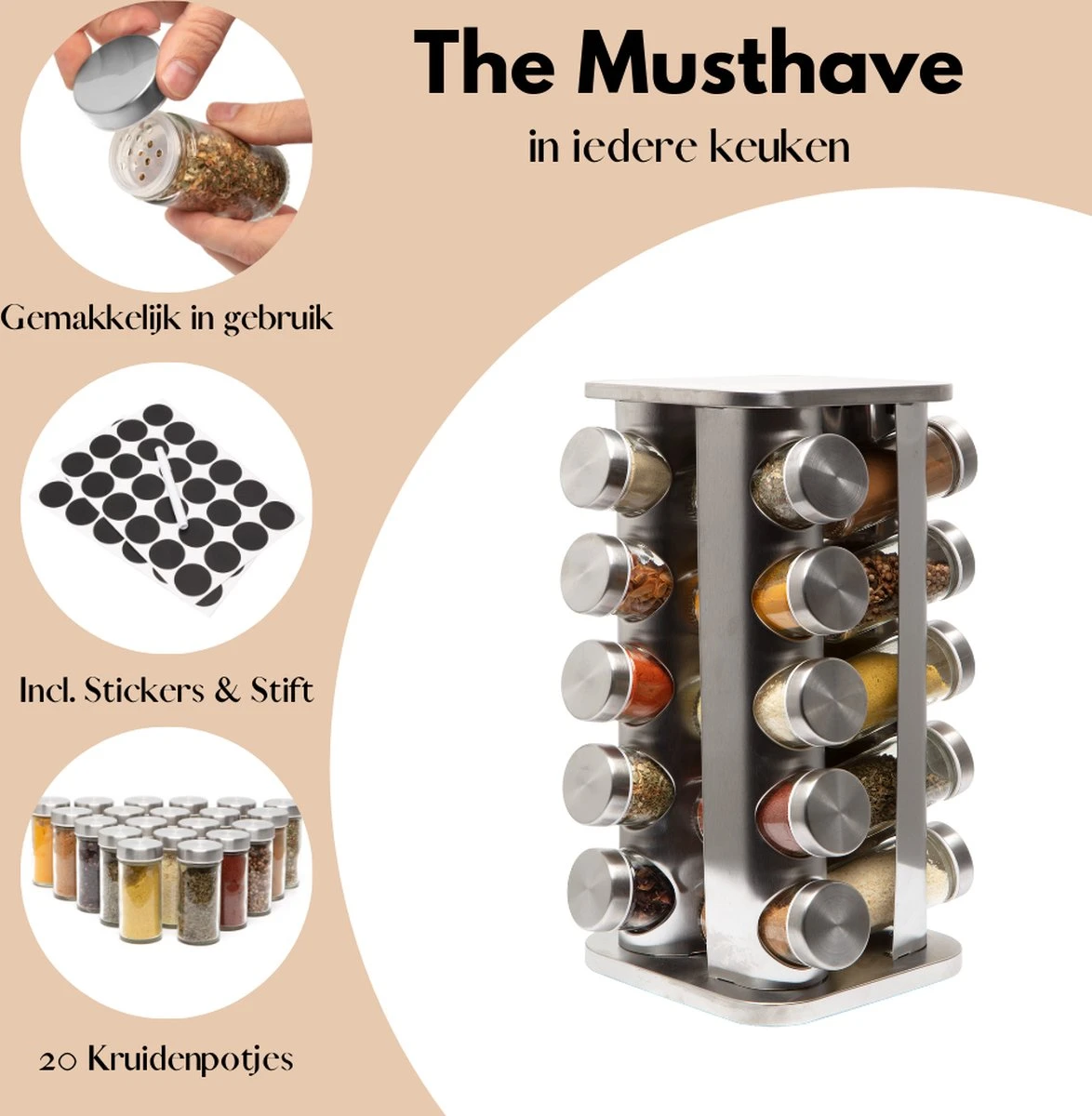 Alle kruiden en specerijen vers, netjes en klaar voor gebruik met onze overzichtelijke kruidencarrousel. Ideaal voor in jouw keuken! Opruimen was nog nooit zo gemakkelijk, de 20 glazen kruidenpotjes kun je vullen met jouw favoriete kruiden en specerijen zodat je nooit meer hoeft te zoeken waar alles staat.