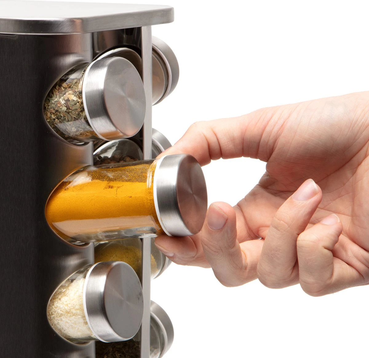De carrousel draait soepel waarbij de potjes goed blijven zitten in de houder. Je kunt eenvoudig de kruidenpotjes vullen en kiezen tussen een fijne of grove dosering. De dekseltjes van de glazen potjes zijn gemakkelijk te openen en zijn zeer stevig, zo kun jij genieten van veel gemak tijdens het koken van het eten.