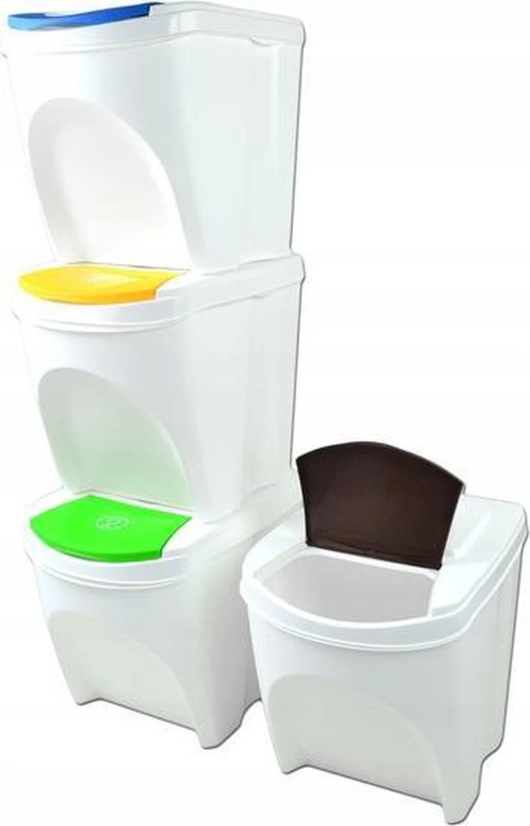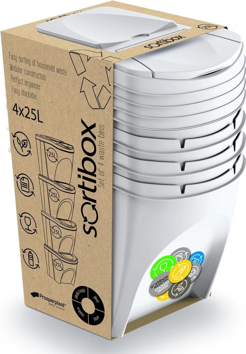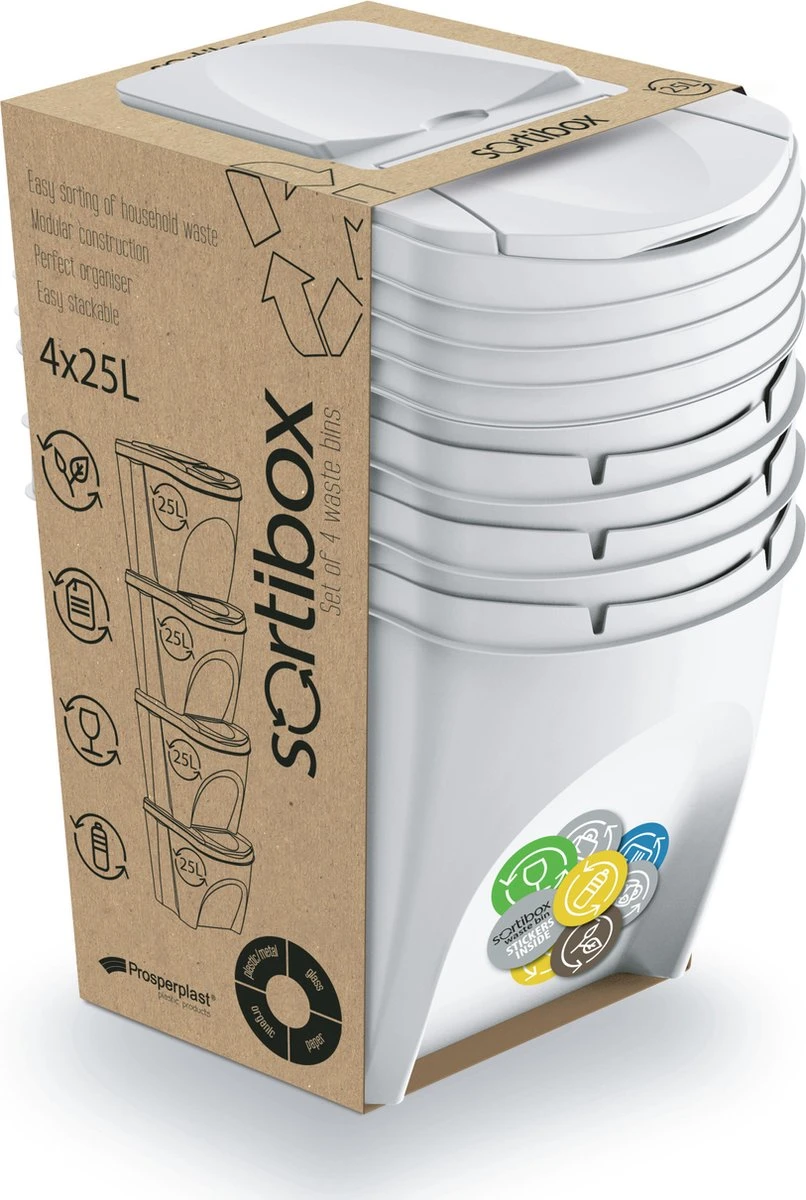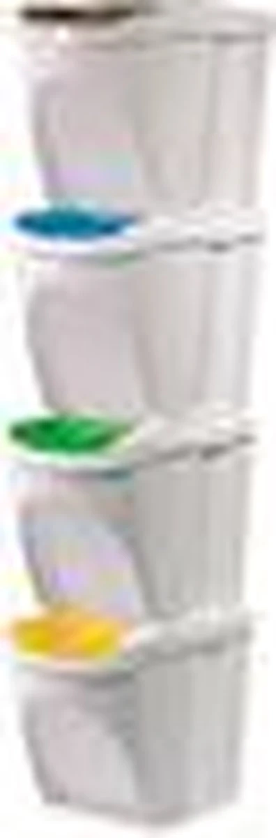 Set van 4x kunststof afvalscheidingsbakken wit, stapelbaar. Inhoud: 4x 25 liter. Formaat per afvalbak: lengte: 40 cm, breedte: 30 cm, hoogte: 34 cm. Inclusief handige kleuren stickers welke verwijzen naar het soort afval voor in de prullenbak.