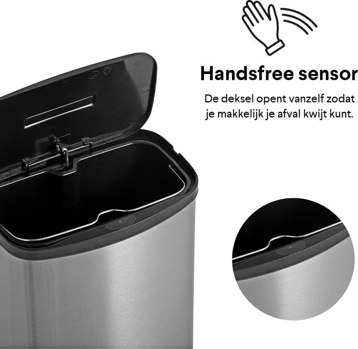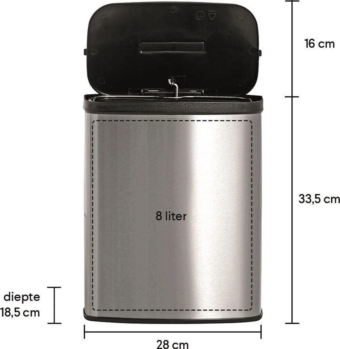 Handig in gebruik, stijlvol in de badkamer of keuken en ook nog eens een leuke prijs; deze Homra sensor prullenbak van 8 liter heeft het allemaal! Nooit meer afval uit uw handen laten vallen terwijl u het deksel van uw prullenbak probeert open te doen, of een pedaal dat blijft hangen waardoor de prullenbak helemaal niet open wil, deze Homra sensor prullenbak gaat open zodra hij detecteert dat u er iets in wilt doen!