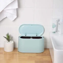 Deze mooie design prullenbak in lichtblauw gaat open en dicht door tikken op de deksel. Het dubbelwandige design verstopt geschikt de vuilniszak. Heel mooi als tafelvuilsnisbakje, in de badkamer, gastentoilet of kinderkamer. Hij is een eycatcher door het retro design en bovendien robuust en handig van formaat.