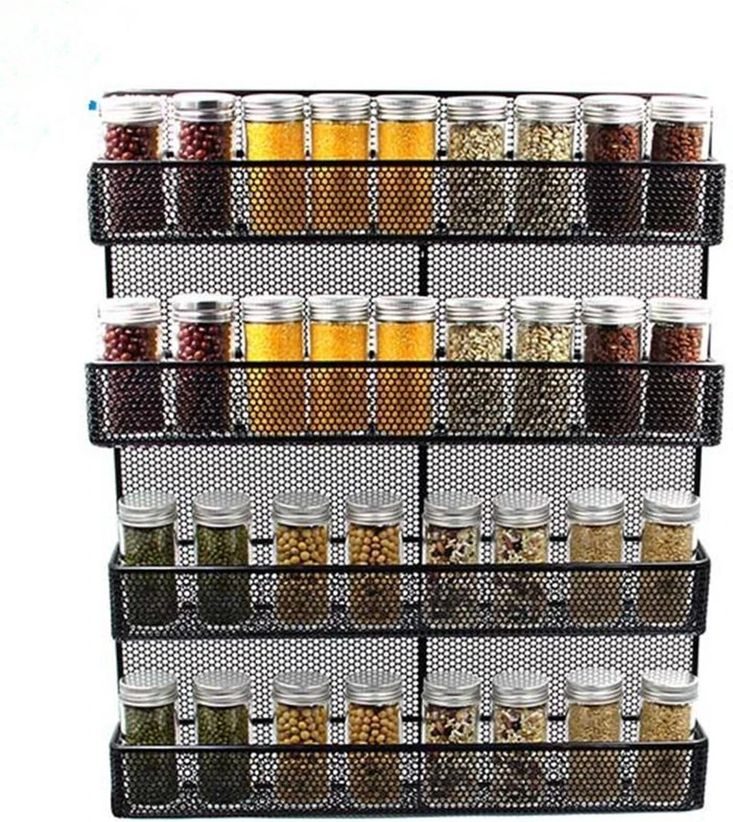 Er passen minimaal 32 kruidenpotjes op het rek. Het kan niet anders, het rek brengt een einde aan alle mogelijke kruiden-chaos. Eindelijk geen gerommel meer met al die losse potjes. Plaats ze soort bij soort of kleur per kleur. Het is wat voor jou het beste werkt.Het rek is plaat besparend en gemakkelijk te bevestigen met de bijgevoegde schroeven. Het ophangen is dan ook een eitje.