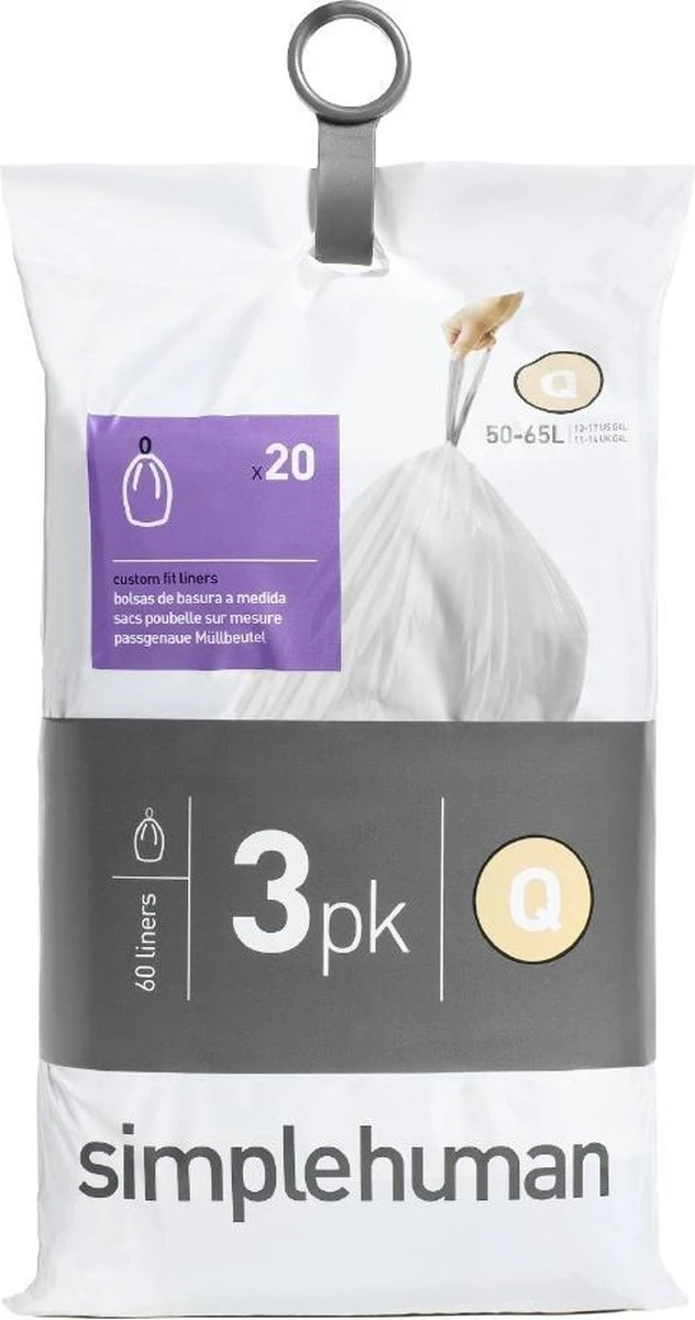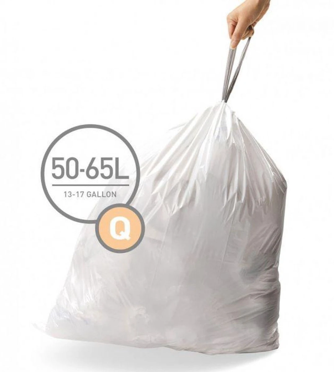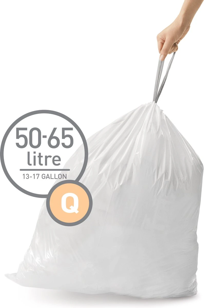 Deze code G afvalzakken van Simplehuman hebben een inhoud van 50 liter en zijn gemakkelijk te sluiten met een trekkoord. Doordat de zakken zijn voorzien van dubbele naden, zijn ze extra stevig. Deze zakken zijn ontworpen om perfect in de afvalemmers van Simplehuman te passen, zodat ze niet wegglijden en volledig verborgen blijven wanneer het deksel gesloten is. In één verpakking zitten 3 pakken van 20 stuks. Daarnaast zijn deze vuilniszakken perfect om in de Pocket Liner gleuf van de Simplehuman afvalbakken te stoppen.