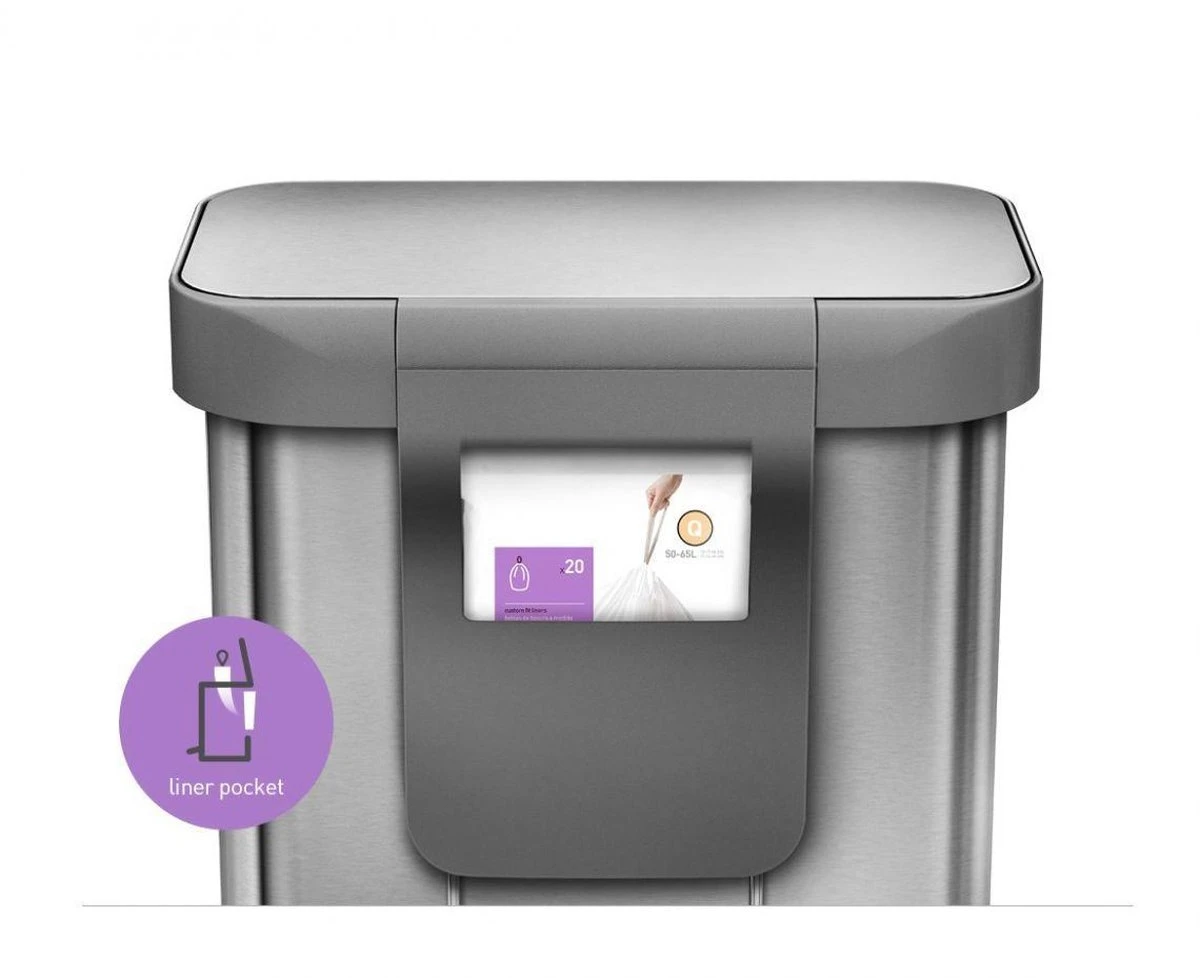 De Liner Pocket heeft een speciaal vakje aan de achterkant voor het opbergen van vuilniszakken. Is de afvalemmer vol? Dan haal je de volle afvalzak eruit en trek je aan de binnenzijde van de emmer gemakkelijk één nieuwe zak los, die je zo in de afvalemmer plaatst. De M-code Liner Pocket vuilniszakken van Simplehuman hebben het perfecte formaat voor deze pedaalemmer. De zak sluit zich stevig om de steunrand en doordat de rand precies onder het deksel valt, kun je de zak niet zien.