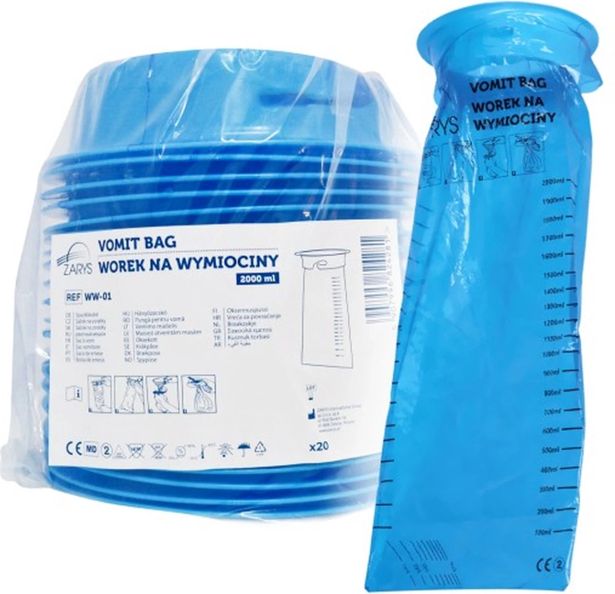 De braakzak van Zarys is een braakzakje uit een duurzame, transparante blauwe folie. De transparante zakje maakt het mogelijk om de afscheidingen te observeren. De nauwkeurige maatverdeling maakt een nauwkeurige schatting van het vloeistofvolume mogelijk.
