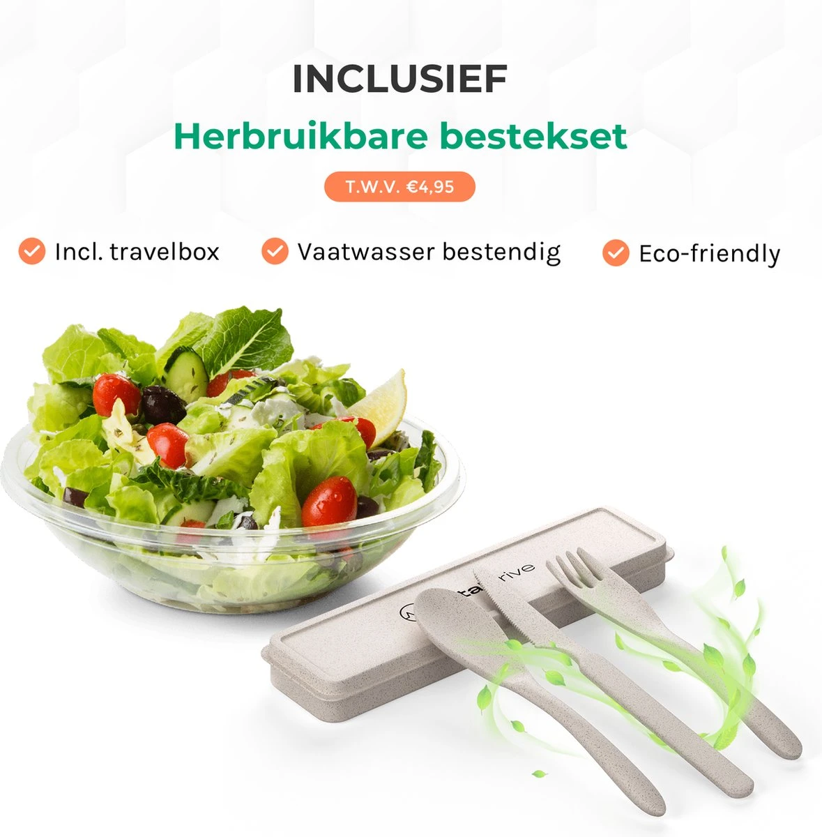 Inclusief herbruikbare bestekset (t.w.v. €4,95) en meal prep E-book (t.w.v. €12,95) bij elke bestelling. Het E-book ontvang je na bestelling in je mail box.