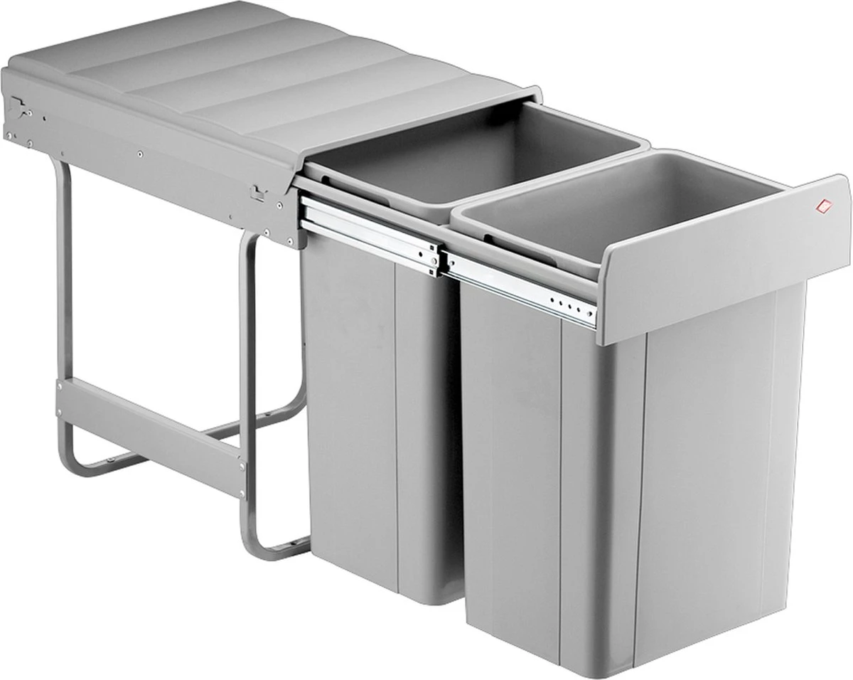 Uittrekbare afvalbak met 2 inzetstukken voor 2-voudige afvalscheiding. De inzetbakken kunnen worden gebruikt voor flessen, plastic afval, papier, organisch afval of restafval, afhankelijk van het individuele afvalvolume. De uittrekbare afvalemmer is bijzonder ruimtebesparend en kan gemakkelijk met vier schroeven op de vloer van de keukenonderkast worden gemonteerd. Hij is geschikt voor onderkasten met een breedte van ten minste 40 cm. De ingebouwde vuilnisbak is uittrekbaar, d.w.z. dat hij tot zijn volledige lengte kan worden uitgetrokken. De montagehoogte is 46,5 cm. Alvorens te bestellen, gelieve te controleren of de emmer onder een bestaande sifon van de gootsteen zal passen.