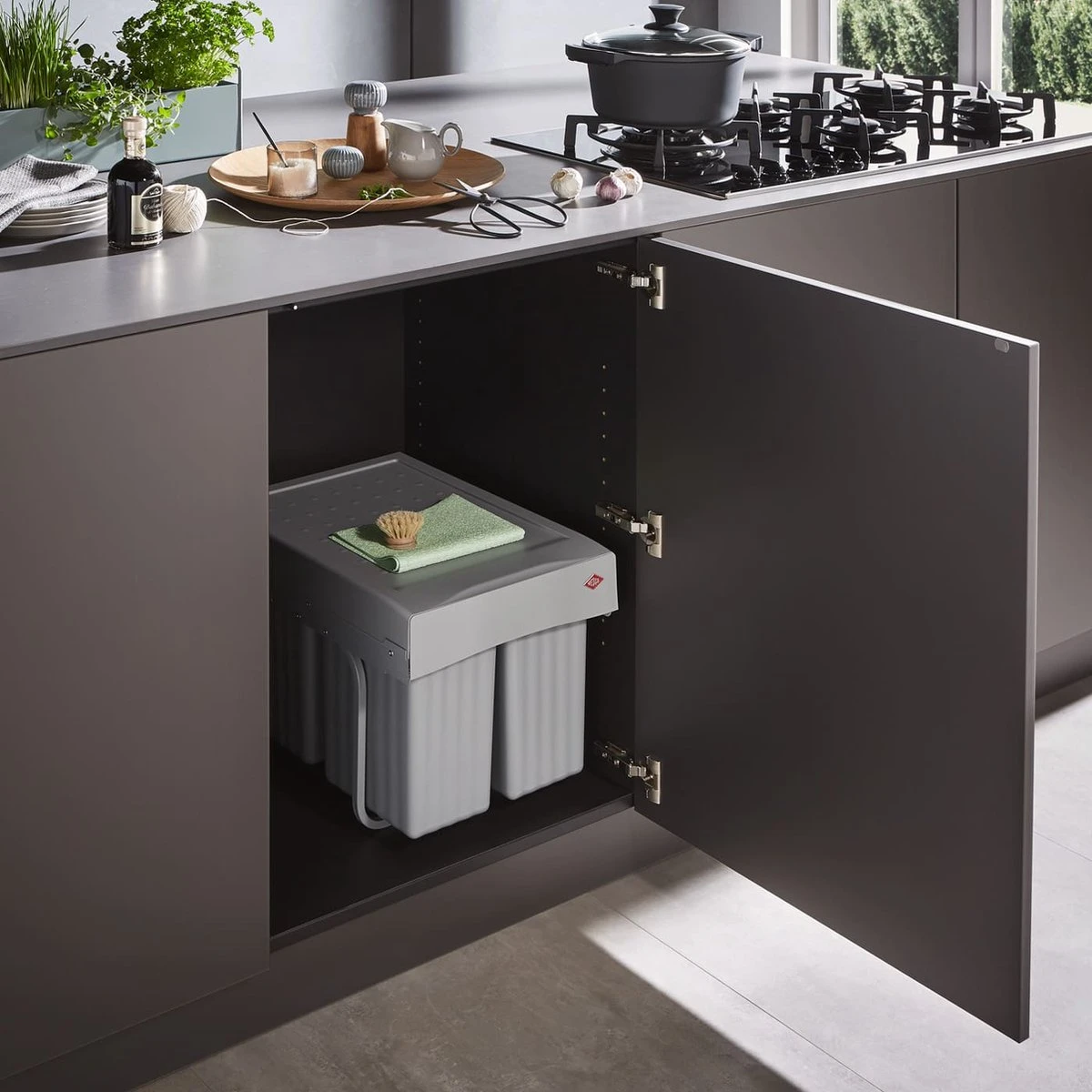 Uittrekbare afvalbak met drie kunststof binnenbakken die uitstekend geschikt zijn voor drievoudige afvalscheiding. Daarin kunnen b.v. organisch afval, restafval en papierafval of flessen praktisch worden gescheiden. De uittrekbare afvalemmer is bijzonder ruimtebesparend en kan gemakkelijk met vier schroeven in een aanrechtkast worden gemonteerd. Hij is geschikt voor aanrechtkasten met een breedte van ten minste 40 cm. De ingebouwde bak is volledig uittrekbaar, d.w.z. dat hij tot zijn volle lengte kan worden uitgetrokken. Door zijn hoogte van slechts 34 cm is hij ook geschikt voor installatie onder een volumineuze gootsteensifon.