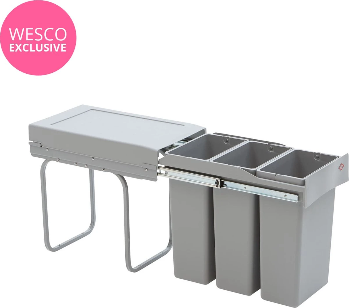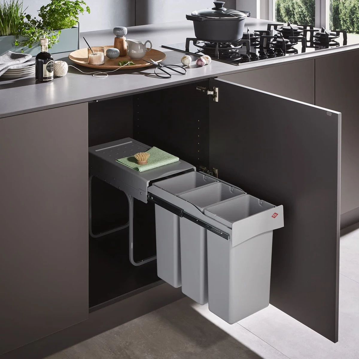 Uittrekbare afvalbak met drie inzetstukken voor 3-voudige afvalscheiding. Restafval, organisch afval en papierafval of glas kunnen op deze praktische manier worden gescheiden. De uittrekbare afvalbak is bijzonder ruimtebesparend en kan met vier schroeven eenvoudig in de keukenonderkast worden gemonteerd. Hij is geschikt voor onderkasten met een breedte van ten minste 30 cm. De ingebouwde afvalemmer is volledig uittrekbaar, d.w.z. dat hij tot zijn volledige lengte kan worden uitgetrokken. De drie kunststof inzetbakken hebben elk een inhoud van 10 liter.