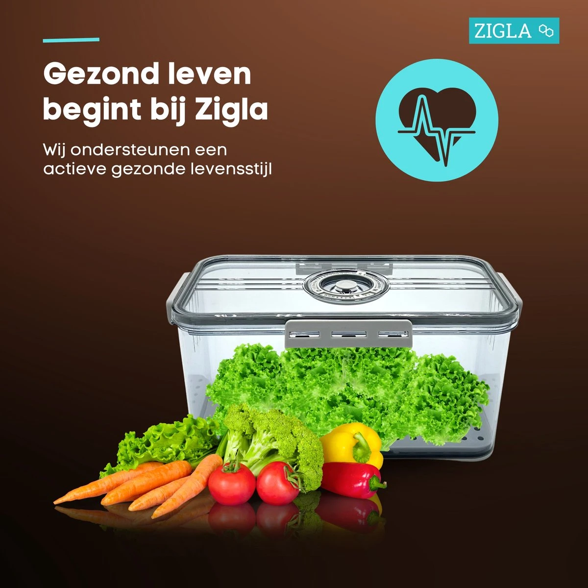 Met de Zigla vershouddoos geniet jij van een praktische en makkelijke voedselcontainer, voorzien van een datumaanduiding en overdrukventiel. De maaltijden kun jij eenvoudig vacuüm verpakken en hierdoor ervoor zorgen dat de maaltijd langer vers blijft en de ingrediënten hun smaak behouden. De foodsaver is naast het bewaren van maaltijden ook uitstekend geschikt voor het marineren doordat alle smaken goed behouden blijven.